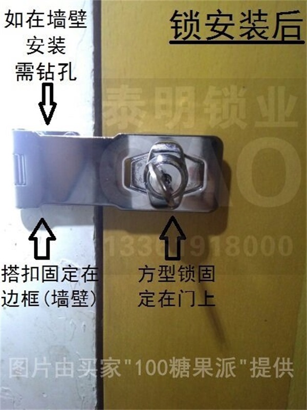 産品安裝和使用示意圖:本鎖爲外裝鎖,不需在家具打孔.隻需安裝幾個螺絲即可完成(chéng)安裝.具有安裝簡單,使用方便,外形美觀的特點