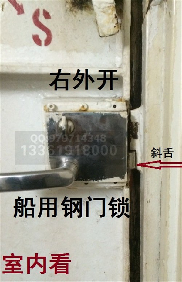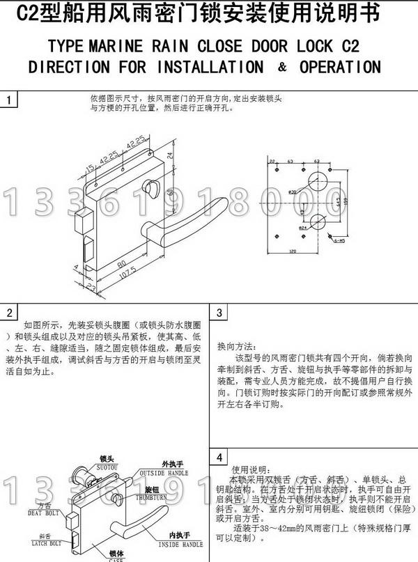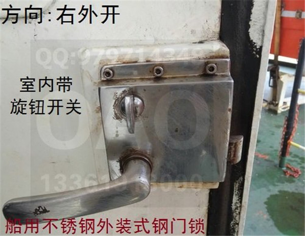 本鎖型号爲OHS-3400,3550船用防火門鎖(國(guó)内型号爲c2船用鎖) 可替代進(jìn)口原鎖安裝,适合與船用鋼門及水下密封門使用,爲外裝鎖.船用物料IMPA編碼:490183 490187。本鎖通過(guò)船用防火測試.鎖體材質爲全304不鏽鋼,鎖頭全銅,每鎖包含3把全銅鑰匙.本鎖采用雙鎖舌,彈子結構.斜舌(活舌)起(qǐ)防風作用,輕推即可關門,方舌(呆舌)有起(qǐ)閉作用.平時(shí)用執手開(kāi)啓,如在室外用鑰匙或室内用旋鈕鎖閉時(shí),執手則不能(néng)開(kāi)啓。适裝在門厚35-45的防火門使用.也可用于加厚防火門.該鎖分内外開(kāi)及左右開(kāi),有4種(zhǒng)方向(xiàng).可按照要求定制1級-3級管理鑰匙,鎖頭可單獨購買.