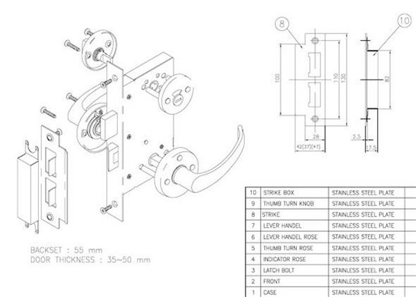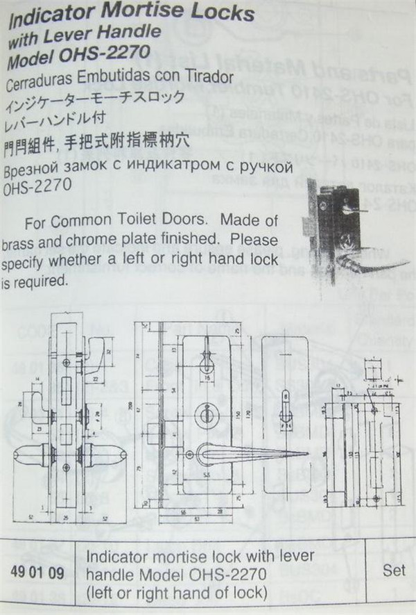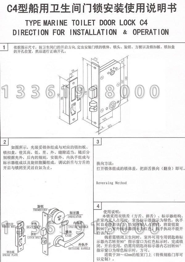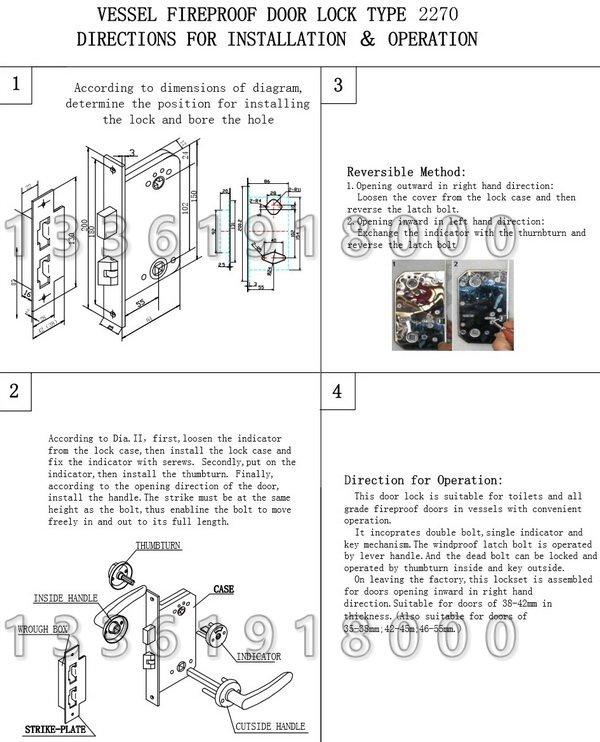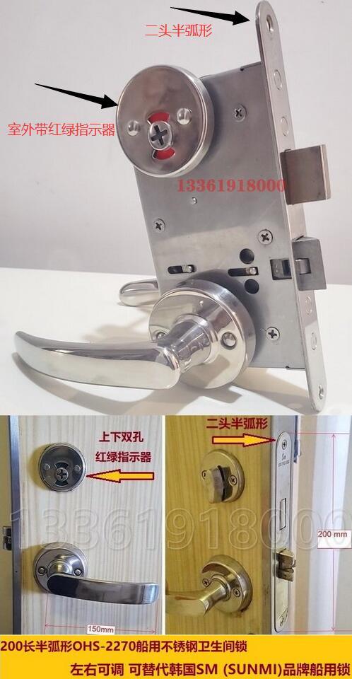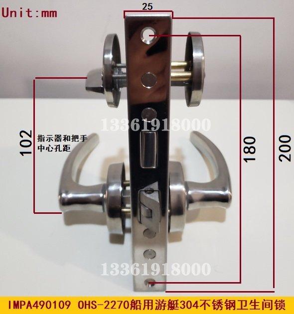 本鎖型号爲C4 OHS-2270船用鎖,IMPA船用物料手冊490109.可替代進(jìn)口Ohshima原裝鎖。本鎖用于船上衛生間,盥洗室防火門。通過(guò)船用防火測試.鎖體及全部配件均爲304不鏽鋼,鑰匙全銅。鎖體總長(cháng)度爲190mm和200MM二種(zhǒng),采用雙鎖舌,一斜舌,一方舌,斜舌起(qǐ)防風作用,方舌起(qǐ)鎖止啓閉作用。室外帶雙色指示器,紅色即爲有人,綠色即爲爲無人。室内帶旋鈕,若在室内將(jiāng)旋鈕轉90度,室外呈紅色顯示時(shí),衛生間即被(bèi)鎖止,執手不能(néng)開(kāi)啓,但室外可使用随帶鑰匙插入指示器開(kāi)啓整套鎖。該鎖适合厚度爲30-50MM的衛生間盥洗室防火門,具有安裝簡單使用方便的特點,适合各類船用,遊艇衛生間,盥洗室防火門使用.