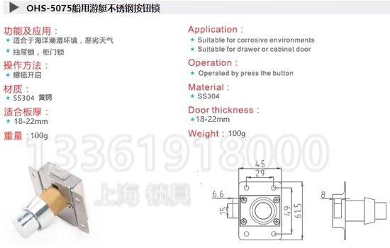 鎖材質爲黃銅和304不鏽鋼.IMPA船用物料名稱OHS-5070 OHS-5075,IMPA編号490215 490216 490217.産品家具開(kāi)孔爲Φ20,斜舌結構,輕推即可自動關門,而開(kāi)門隻需按下按鈕同時(shí)拉動拉手打開(kāi).本鎖具有外形美觀,安裝簡單,使用方便的特點.适合17-22MM闆厚輪船,軍艦,艦艇,遊艇,房車,陸地家具的抽屜,櫥門,廚房箱櫃鎖等使用