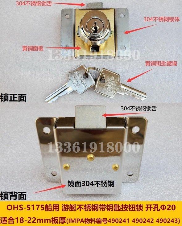 本鎖根據日本OHSHIMA公司OHS-5170 OHS-5175系列船用門鎖生産,産品材質爲黃銅和304不鏽鋼.産品材質和規格尺寸同原鎖完全一緻.國(guó)内型号爲PH4226 c6不鏽鋼按鈕門鎖,掀鎖.本鎖分左、中、右三種(zhǒng)規格:中式抽屜鎖,型号爲5175-1,船用IMPA物料編碼490241、490242、490243.右式櫥門鎖,型号5175-2,船用IMPA物料編碼490244、490245、490246.左式櫥門鎖,型号5175-3,船用IMPA物料編碼490247、490248、490249,型号對(duì)應見圖紙.本鎖材質爲:鎖體304不鏽鋼,鎖面(miàn)闆和鎖頭爲全銅,表面(miàn)電鍍亮鉻.每鎖包含3把全銅鍍鎳鑰匙.鎖頭直徑Φ20,按鈕式鎖頭,按下鎖頭,鎖舌下移,門可開(kāi)啓.鎖舌爲斜舌結構,輕推即可自動關閉.本鎖爲帶鑰匙款,鑰匙旋轉360度鎖緊鎖頭,按鈕被(bèi)鎖止.本鎖根據安裝門闆厚度有2款套圈可選擇,适合16mm-20mm厚度的家具使用.可定制一級管理鎖.本鎖具有外形美觀、安裝簡單、使用方便的特點,适用于輪船,軍艦,艦艇,遊艇,房車等各種(zhǒng)抽屜,櫥門,櫥櫃,檢修門等家具使用.
