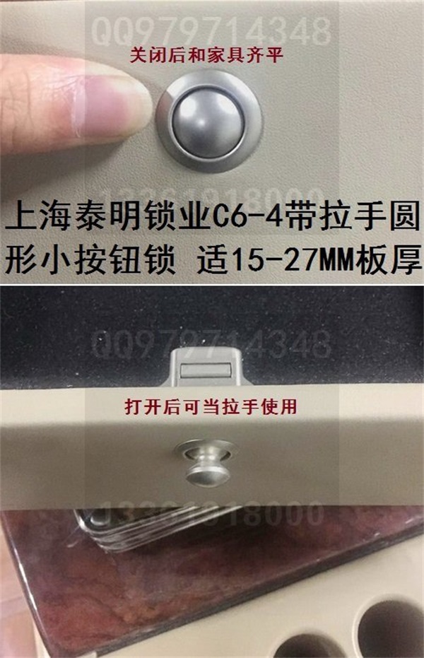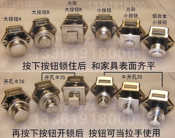 本鎖特點爲安裝關閉後(hòu)與家具表面(miàn)持平,不凸起(qǐ).按下按鈕即可鎖止關門,開(kāi)門隻需按下按鈕後(hòu)拉動按鈕開(kāi)啓.本鎖既帶鎖止功能(néng)同時(shí)也帶拉手功能(néng).開(kāi)啓和關閉帶有"嗒塔"提示音,具有安裝簡單,使用方便,開(kāi)關靈活,外觀精美的特點.本鎖開(kāi)孔爲Φ20,适合各類15-27MM闆厚船用,遊艇,房車,陸地家具的抽屜,櫥門,櫥櫃等家具使用