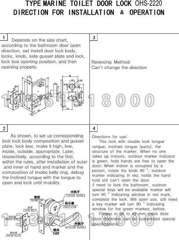 本鎖型号爲OHS-2220,C5-A船用衛生間盥洗室防火門鎖,船用IMPA物料編碼490108,可替換進(jìn)口原裝鎖安裝使用。通過(guò)船用防火測試.鎖體材質全爲304不鏽鋼。用于船上衛生間,盥洗室防火門。鎖體總長(cháng)爲140MM,鎖體孔距120MM,本鎖采用單斜舌,雙執手結構。斜舌起(qǐ)防風作用。室外帶雙色指示器,紅色即爲有人,綠色即爲爲無人。室内帶旋鈕,若在室内將(jiāng)旋鈕轉90度,室外呈紅色顯示時(shí),衛生間即被(bèi)鎖止,執手不能(néng)開(kāi)啓,但室外可使用随帶鑰匙插入指示器開(kāi)啓整套鎖。産品具有安裝簡單,使用方便的特點,适合各種(zhǒng)厚度在30-50MM的船用過(guò)道(dào)防火門,通道(dào)防火門,防風門等使用.也可用于加厚防火門使用.